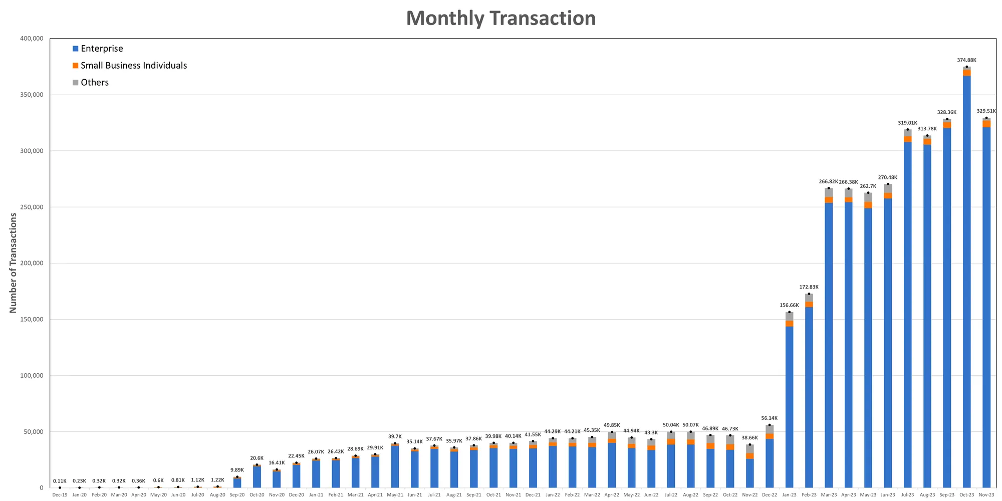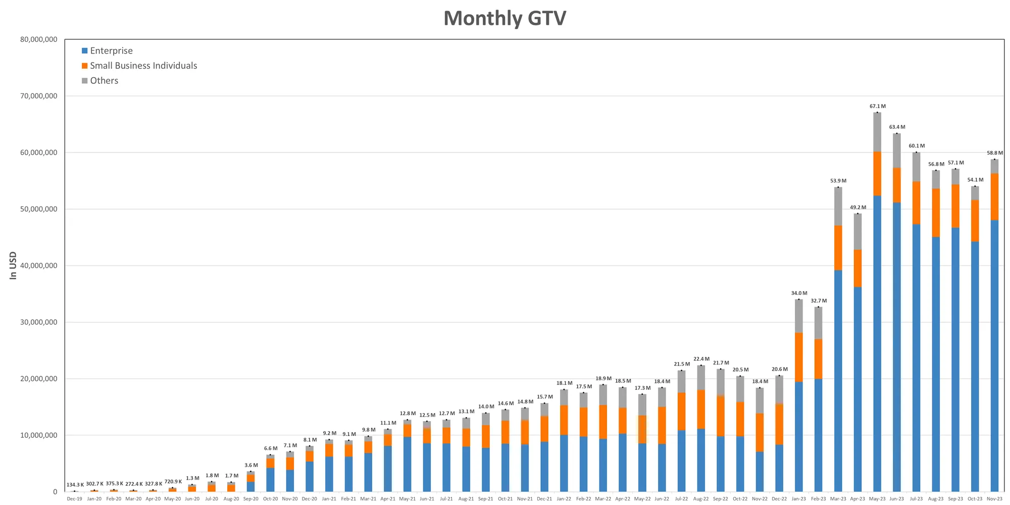 November witnessed a resurgence in our monthly revenue, hitting $174k – a 17.41% increase from the previous month. This was primarily driven by our consumer cross-border payment sector. Overall, our Gross Transaction Volume (GTV) also grew by 8.80%, reaching $58.8 million.