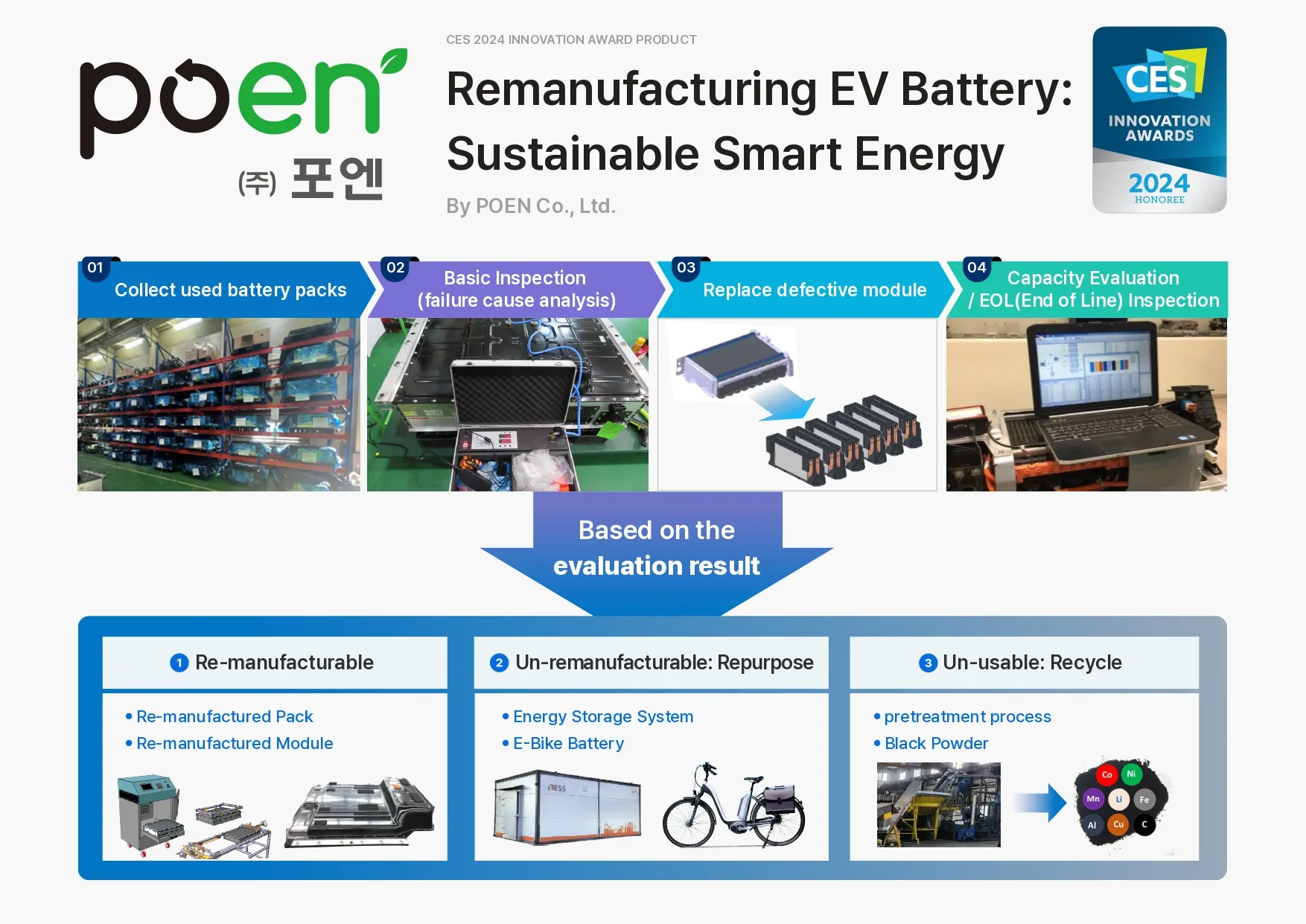 최성진 포엔 대표는 "이번 수상은 CES에서 재제조 분야 첫 혁신상 사례이자 포엔의 지속 가능한 기술과 비전을 세계적으로 인정받은 것으로, 전기차 산업에 큰 변화를 가져올 것"이라고 말했다.