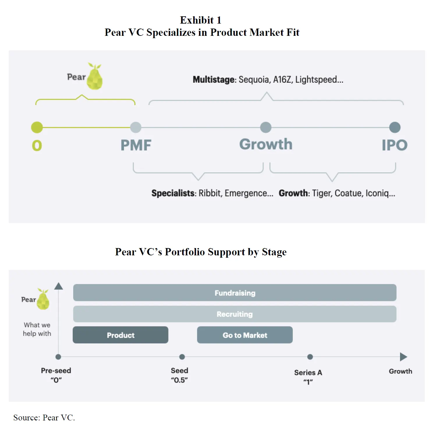 Pear made initial investments in start-ups spanning three stages of company development: 1) preseed, which Pear termed “soil”; 2) seed; and 3) Series A.10 Founders or teams at the pre-seed