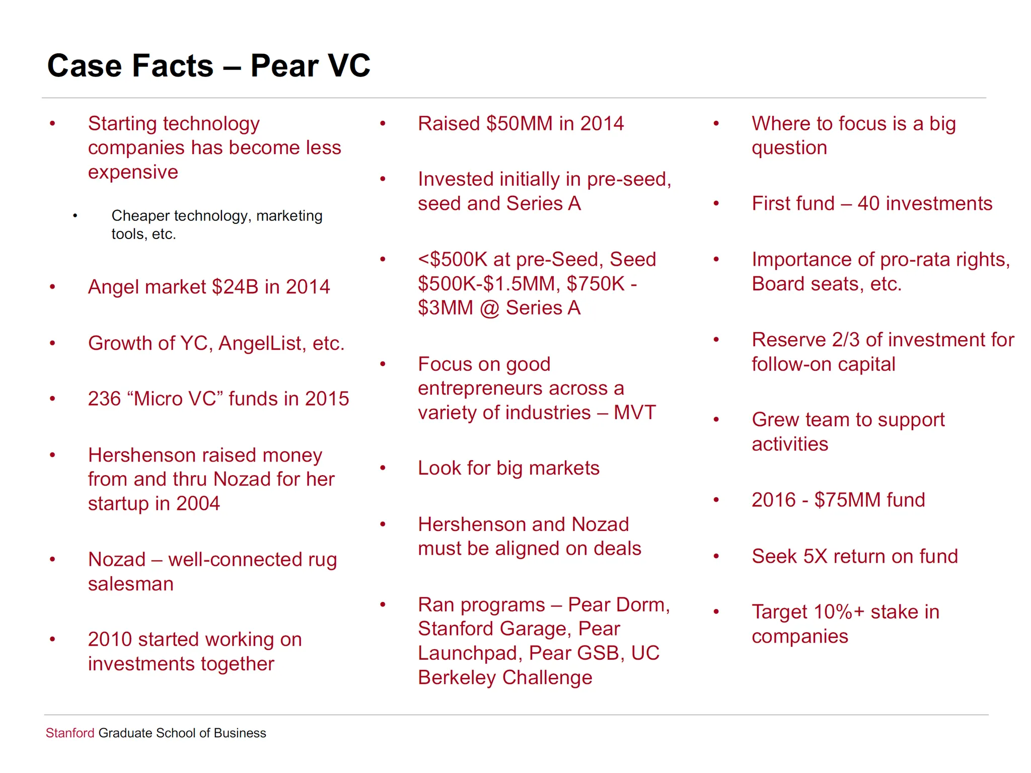 had confidence that, with the appropriate resources and mentorship, the founders would ultimately develop a solid company. Nozad elaborated: “At the pre-seed stage, we’re looking for teams that don’t yet have a working product. Ideally, they have a prototype, but a prototype isn’t necessary if we find the right entrepreneurs.”11 Pear invested up to $500,000 per company at the pre-seed stage.