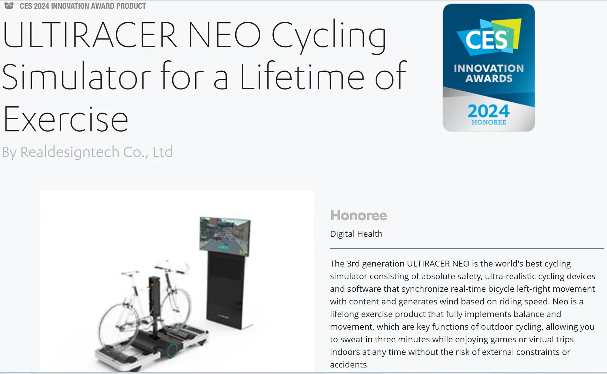 스포츠테크 프로젝트로 개발한 3세대 얼티레이서 "ULTIRACER NEO"가 CES2024 디지털 헬스 부문 혁신상을 수상했습니다.