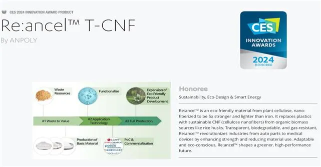17일 에이엔폴리에 따르면 왕겨, 커피박 등 기존에 버려지던 유기성 폐자원으로 만든 나노셀룰로오스 제품(Re:ancelTM T-CNF)이 친환경적인 신소재로 인정받아 CES 2024 지속가능성 부문에서 혁신상을 받았다.