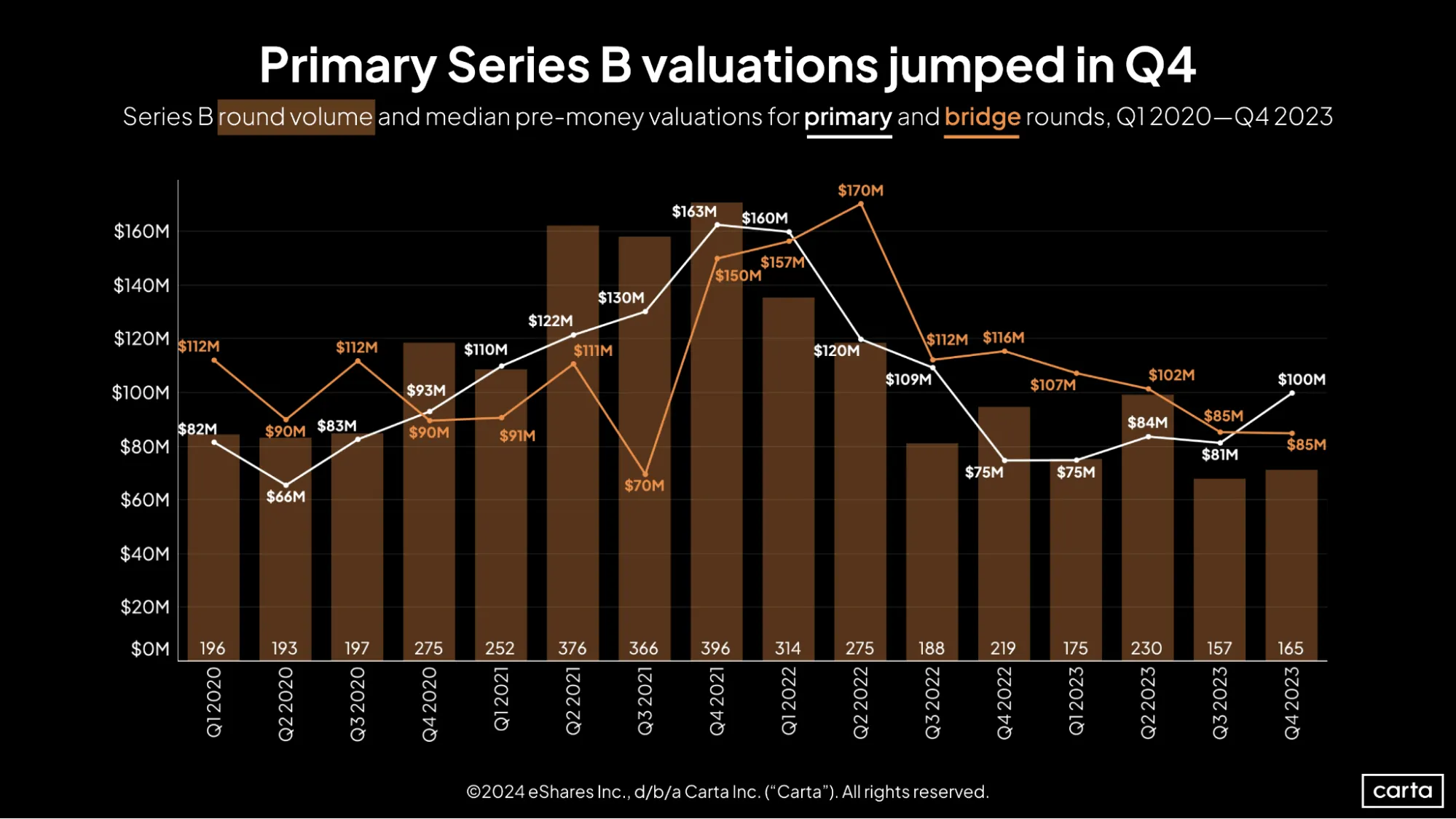 Carta의 조사에 따르면 일반적인 시리즈 B 단계에서의 기업가치는 $85 million에서 $100 million의 범위에서 중간값이 형성되고 있습니다.
